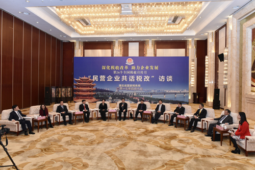 | | “民营企业共话税改”访谈 | 这个4月,恰值第26个全国税收宣传月,本次宣传月的主题是“深化税收改革、助力企业发展”。4月6日上午,6位分别来自地产、建筑、金融、证券、餐饮和制造业的湖北民营企业家代表,以及财税专家、媒体记者齐聚湖北武昌,参加由湖北省国税局举办的“民营企业共话税改”访谈活动,畅谈“营改增”(营业税改征增值税)改革红利,纵论税收改革发展大势,共同探讨如何更好地发挥税收对民营经济发展的促进作用。 | | 访谈时间:2017-04-06 09:01:17 | | 主题嘉宾:湖北省国家税务局党组书记、局长:胡立升 , 湖北省国家税务局党组成员、副局长:柳现青 , 湖北省国税局党组成员、副局长:郑克俭 | |